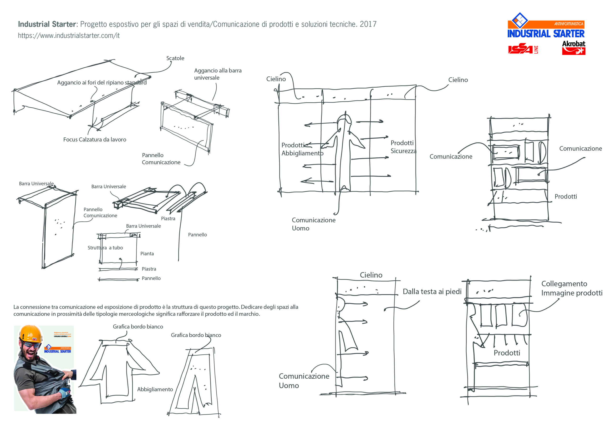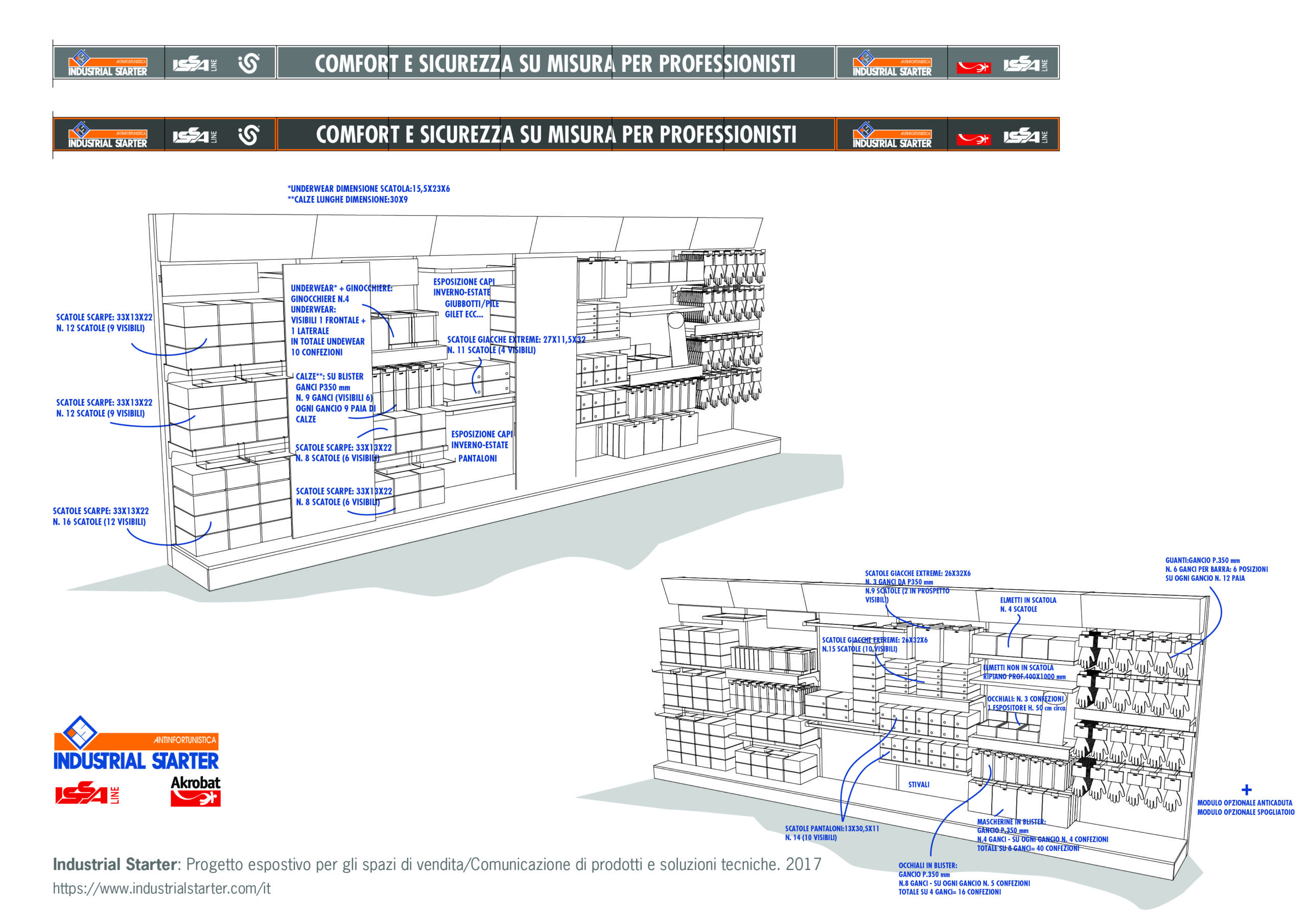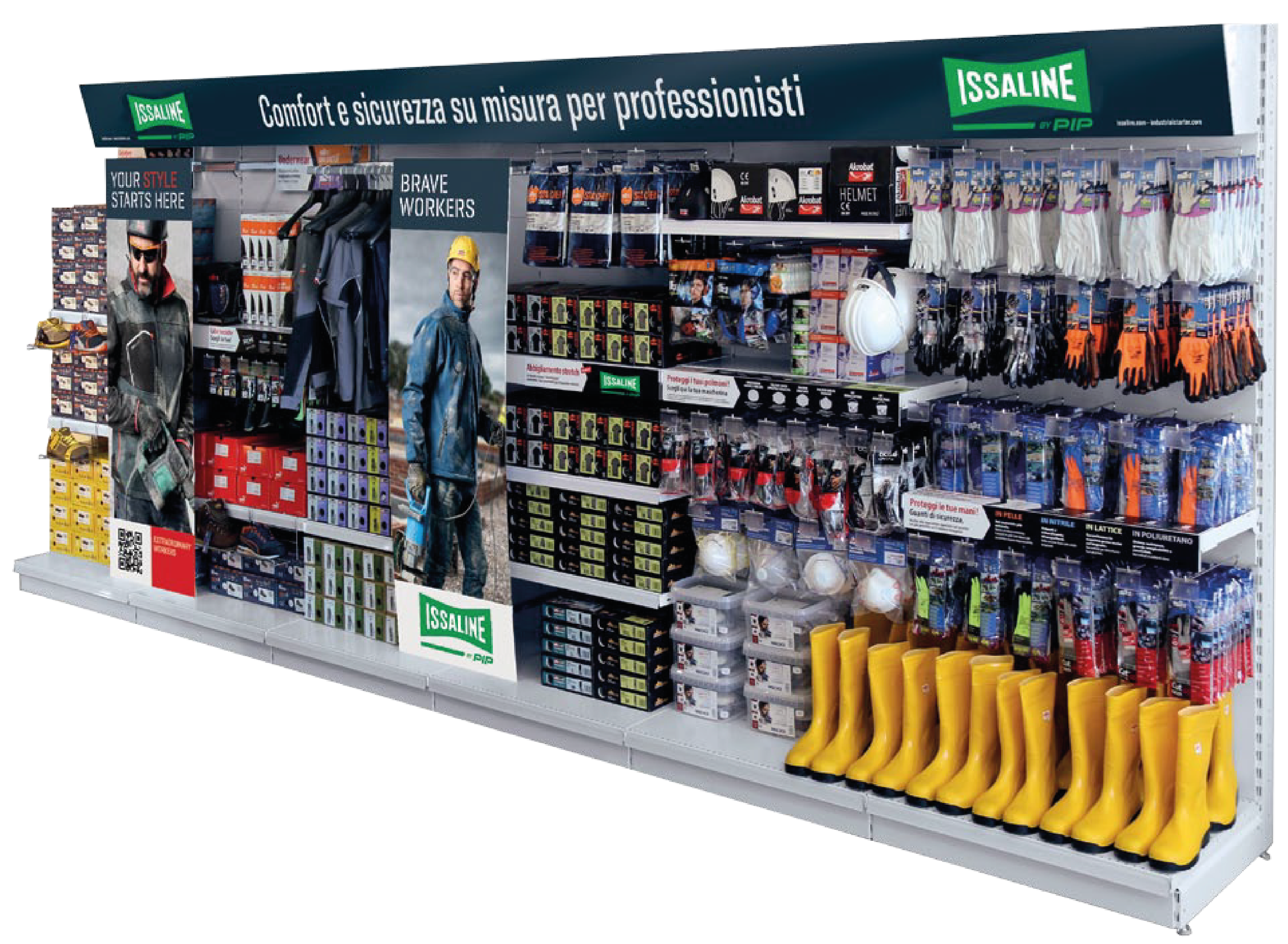 LA NOSTRA SOLUZIONE. Abbiamo sviluppato un progetto espositivo completamente su misura, basato su un’analisi approfondita dei prodotti, dei packaging e dei planogrammi, che ci ha permesso di definire un layout funzionale ed efficace. Lo studio dei planogrammi è stato fondamentale per organizzare in modo strategico il posizionamento delle diverse categorie merceologiche, ottimizzando i flussi e migliorando la leggibilità dell’offerta. La selezione delle scaffalature è stata pensata per garantire la massima visibilità e accessibilità dei prodotti, affiancata dalla progettazione di elementi espositivi speciali studiati per valorizzare al meglio l’esposizione e massimizzare lo spazio disponibile. Il progetto è stato completato da una comunicazione efficace, articolata su tre livelli: dall’identità del brand e dalla sua immediata riconoscibilità, alla segmentazione delle linee di prodotto, fino alle informazioni tecniche e alle caratteristiche specifiche di ogni articolo. Una strategia completa e strutturata che ha permesso a Industrial Starter di costruire un layout merceologico pensato come strumento di vendita a libero servizio su scala nazionale, migliorare la fruibilità dell’offerta e consolidare la propria presenza nel settore dell’abbigliamento da lavoro e dei DPI.
